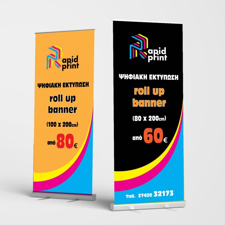 Roll up banner με αυτόματο μηχανισμό μαζέματος αλουμινίου και τσάντα μεταφοράς ψηφιακή εκτύπωση σε pet με γκρι πλάτη για καλύτερο αποτέλεσμα του εικαστικού  διατίθεται σε 2 διαστάσεις  80 και 100 cm